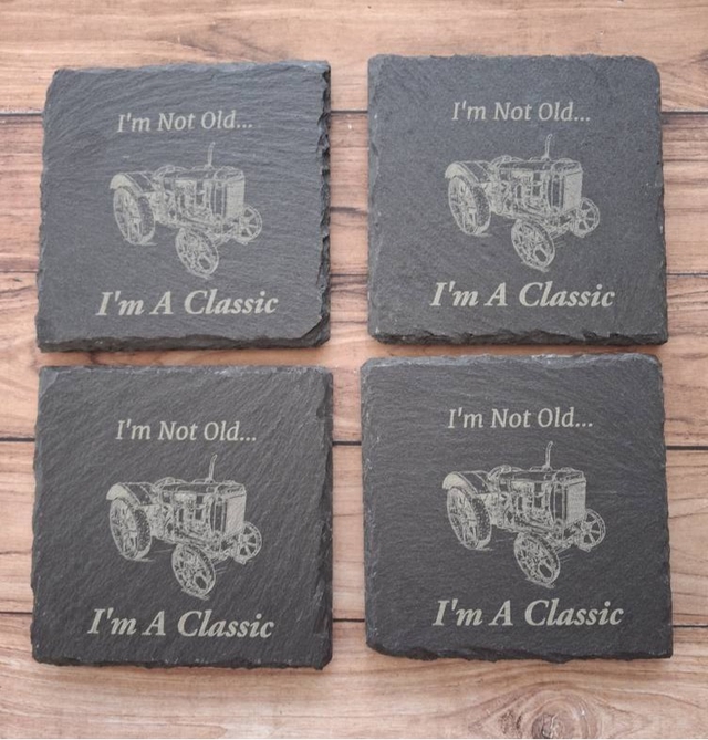 Looking for a unique and funny gift for the old classic tractor enthusiast in your life? Check out our Laser Engraved Slate Coasters! Made from real slate with a rough cut edge, these coasters feature a hilarious design that's sure to make your loved one chuckle. Plus, the rubber feet on the bottom prevent any unsightly marks on surfaces. These coasters make the perfect addition to any home, and are sure to be a conversation starter at any gathering. Order now and give a gift that's both practical and entertaining!
